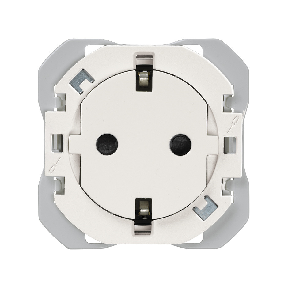 Base de enchufe Clean schuko de la SERIE SIMON 270 para empotrar, perteneciente a la subserie S270 Estética Mínima en color blanco. Diseñada para integrarse en la colección de mecanismos de la gama, ofrece una estética moderna y discreta, ideal para inst