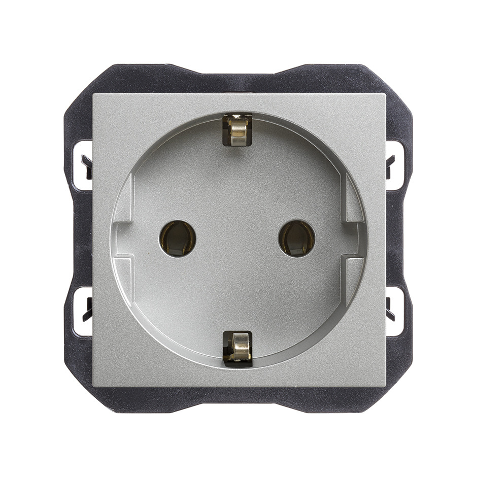 Base de enchufe Schuko de empotrar perteneciente a la Serie Simon 270, colección de mecanismos con estética tradicional ICON. Diseñada para instalación en mecanismos de empotrar, cuenta con embornamiento por tornillo que garantiza una conexión segura y f
