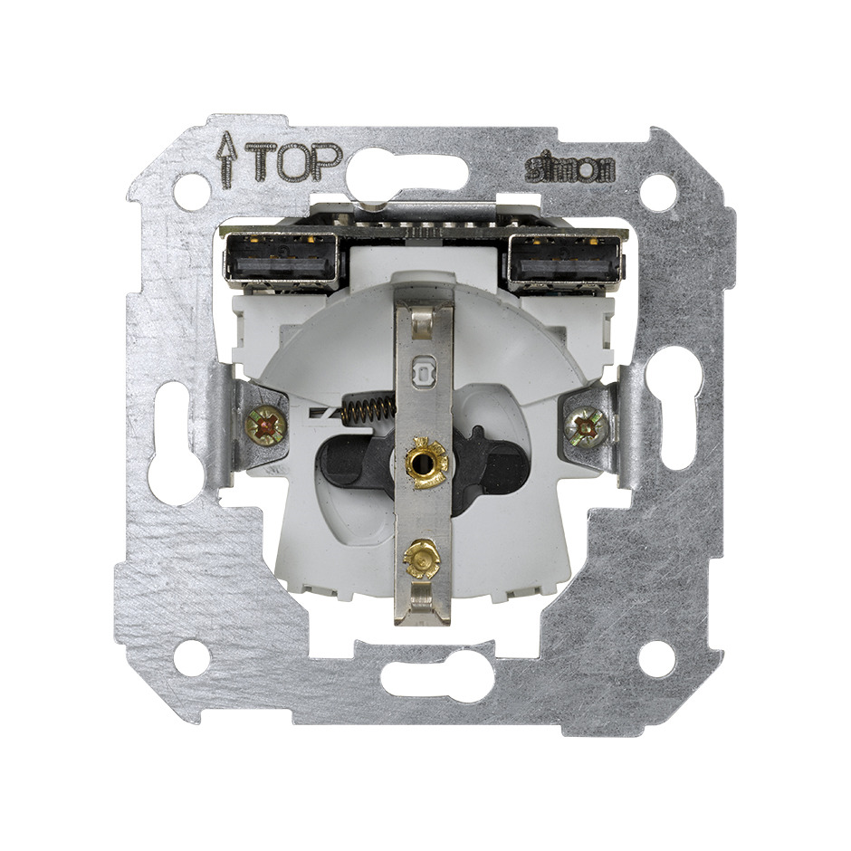 Base schuko con doble cargador USB 2.1A integrada, perteneciente a la Serie 75 de mecanismos empotrables. Permite la conexión simultánea de equipos eléctricos convencionales mediante toma schuko y la carga directa de dispositivos móviles y otros equipos