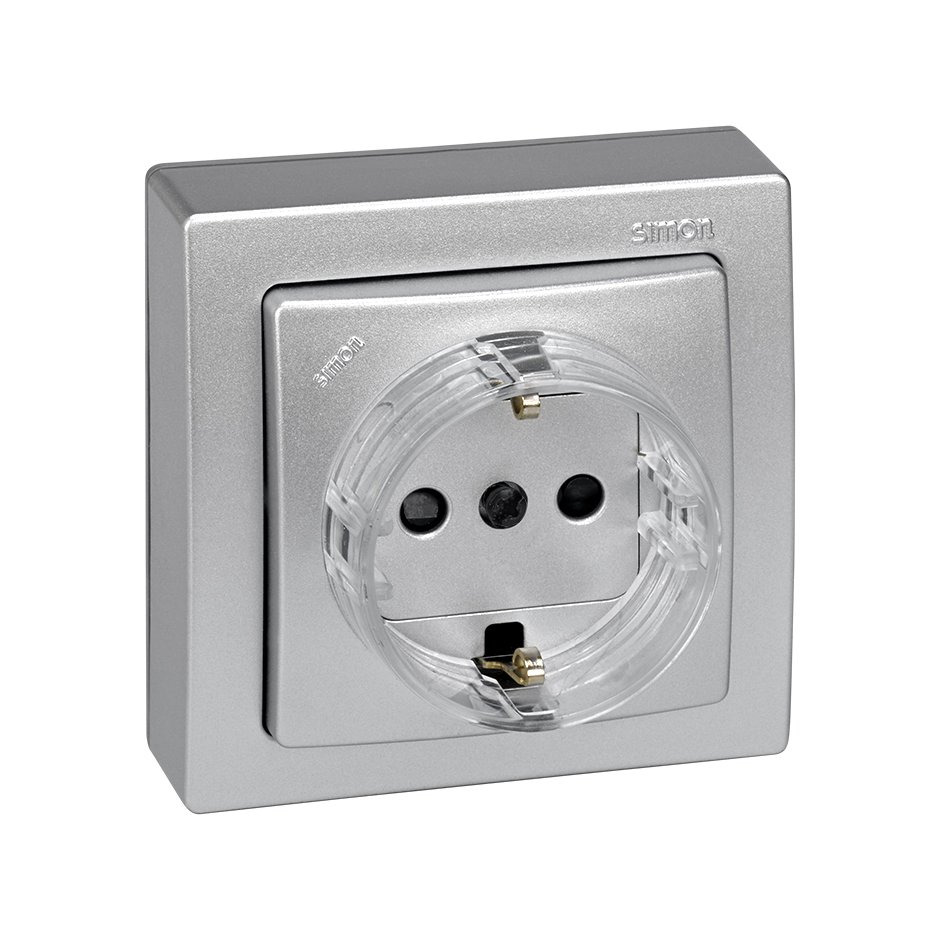 Base de enchufe Schuko monobloc en acabado aluminio perteneciente a la Serie 73 LOFT, diseñada para instalaciones en superficie dentro de la colección de mecanismos. Ofrece una solución estética y funcional para viviendas y espacios comerciales, con un d
