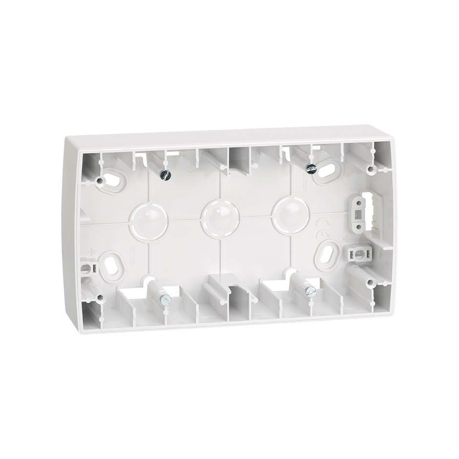 Caja de superficie alta para 2 elementos, diseñada para la instalación de mecanismos de la Serie 82 de empotrar cuando no es posible realizar rozas en pared. Permite montar interruptores, enchufes u otros mecanismos de la colección de mecanismos Serie 82
