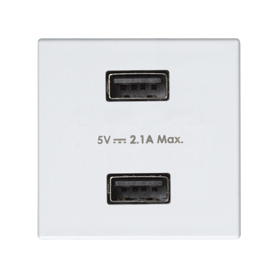 Cargador empotrable con doble puerto USB para instalación en mecanismos Serie 27. Proporciona salida de 5 VDC y 2,1 A, ideal para la carga segura y eficiente de smartphones, tablets y pequeños dispositivos electrónicos sin necesidad de adaptadores adicio