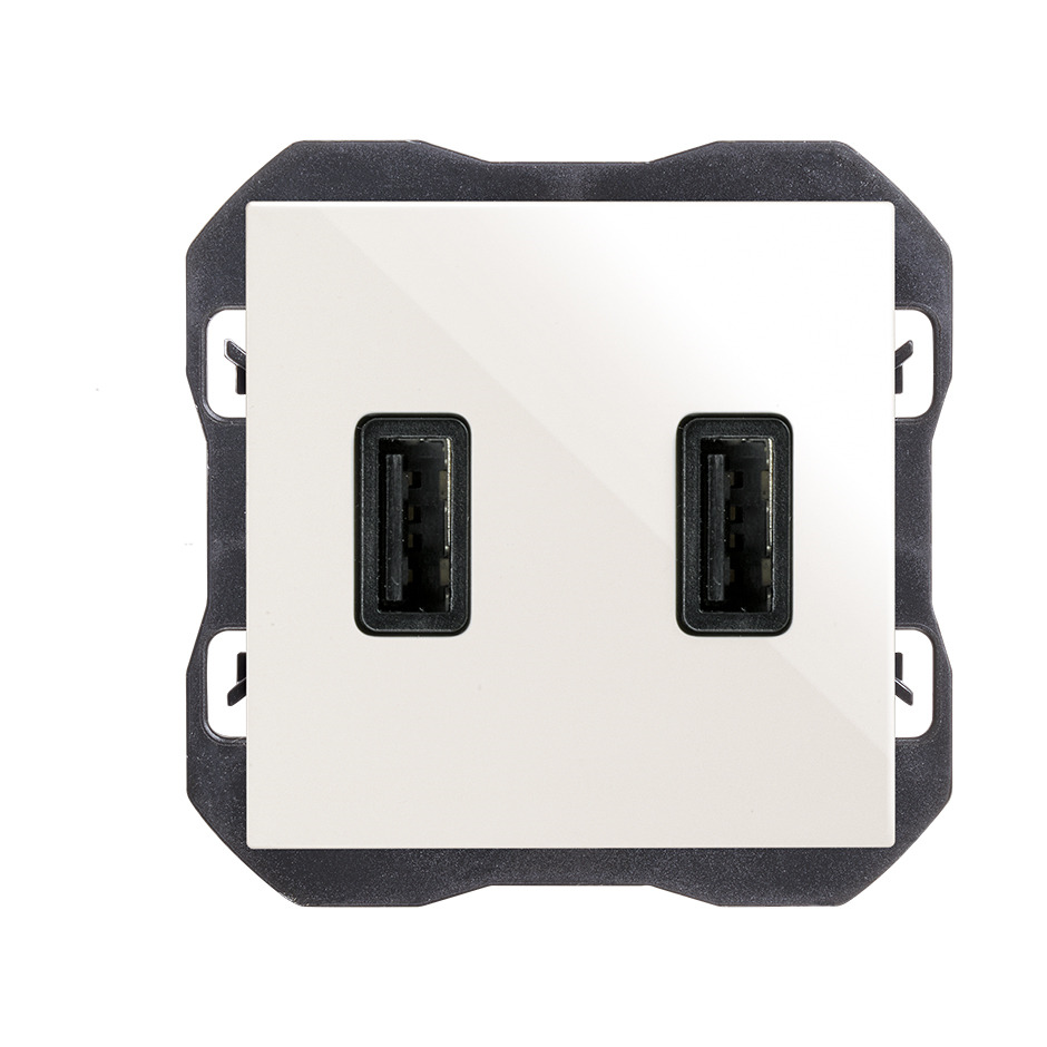 Cargador USB doble A+A de 3,1A con tecnología Smartcharge, diseñado para la carga rápida y segura de dos dispositivos de manera simultánea. Integrado en la Colección de mecanismos de la SERIE SIMON 270 para empotrar, pertenece a la subserie S270 Estética