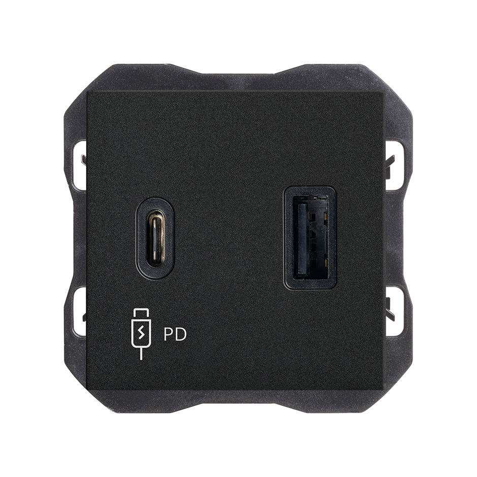 Cargador USB doble C+A de 30W con tecnología PowerDelivery, diseñado para la Serie Simon 270 de mecanismos empotrados. Permite cargar de forma rápida y segura dispositivos compatibles (smartphones, tablets y otros equipos electrónicos) gracias a sus dos