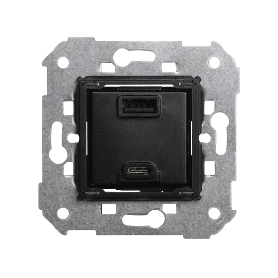 Cargador USB doble empotrable de la Serie 75, diseñado como mecanismo integrable en instalaciones eléctricas de interior. Incorpora una toma USB tipo C con tecnología Power Delivery y una toma USB tipo A, con corriente total de salida de hasta 3,1 A, per
