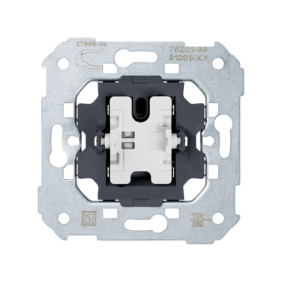 Conmutador de la Serie 75, perteneciente a la colección de mecanismos empotrables. Diseñado para instalaciones eléctricas interiores, ofrece un accionamiento suave y fiable para el control de la iluminación u otros circuitos. Forma parte de la subserie S