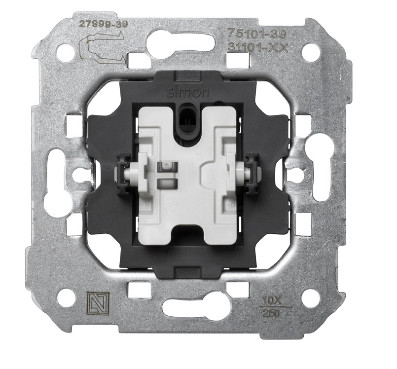 Interruptor unipolar de la Serie 75, diseñado para instalación empotrada dentro de la colección de mecanismos, ideal para el control sencillo de circuitos de iluminación o pequeños receptores. Pertenece a la gama de mecanismos de alta calidad, con refere