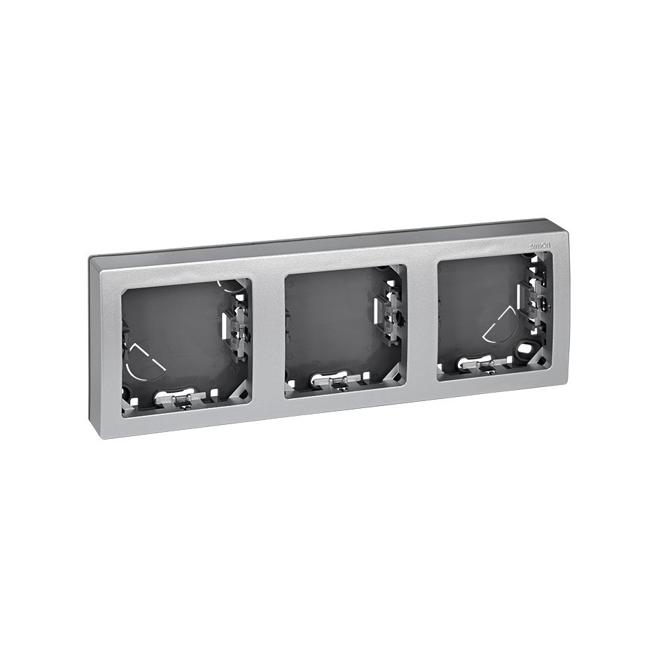Marco de 3 elementos en disposición horizontal de la Serie 73 LOFT, acabado en aluminio. Diseñado para mecanismos de superficie, forma parte de la colección de mecanismos Serie 73 Loft, ideal para instalaciones vistas modernas y funcionales. Compatible c