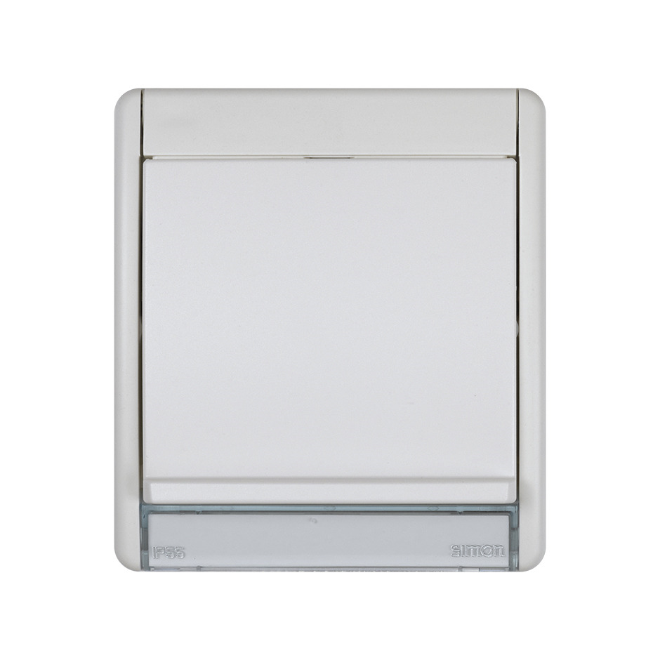Pulsador gris estanco de la serie Simon Aqua, diseñado para instalaciones en superficie que...