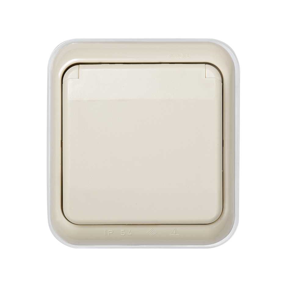 Pulsador gris estanco de la serie Simon Aqua, diseñado para instalaciones en superficie que...