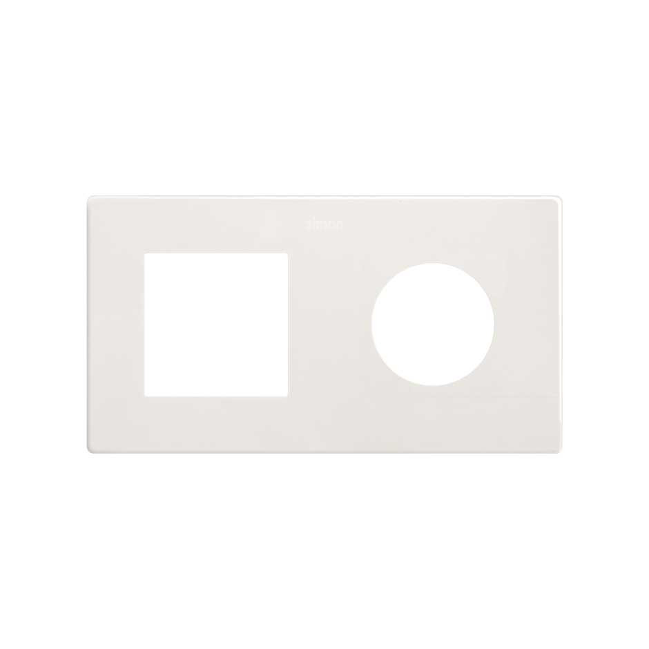 Marco mínimo de 2 elementos para enchufe en color blanco, perteneciente a la Serie Simon 270 de mecanismos empotrables, estética Mínima. Diseñado para instalaciones de la colección de mecanismos Simon, permite montar dos elementos de enchufe manteniendo