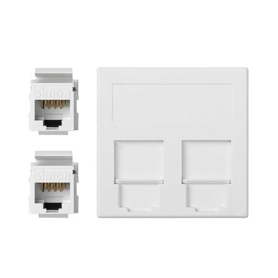 Placa VD plana blanca Simon 500 CIMA para puestos de trabajo, perteneciente a la solución Connect. Diseñada para integrar 2 tomas de datos RJ45 categoría 5E UTP (2 x CAT5EU), permite una ordenación limpia y segura del cableado de voz y datos en oficinas,