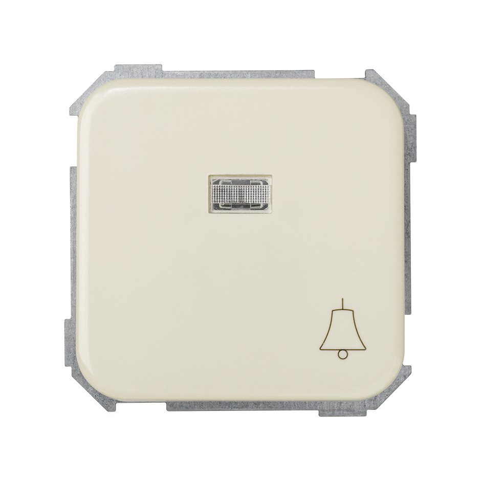 Pulsador con grabado de campana y señalización luminosa integrado en la Colección de mecanismos SERIE 31 para empotrar. Diseñado para identificar claramente la función de timbre o llamada, incorpora un testigo luminoso que facilita su localización en amb
