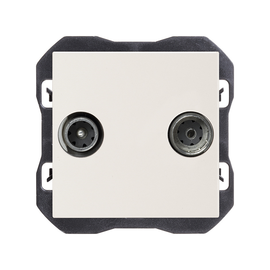 Toma R-TV+Sat final de la Serie Simon 270, diseñada para instalaciones empotradas en pared dentro de la colección de mecanismos. Pertenece a la subserie S270 Estética Tradicional Icon en color blanco, ideal para integrarse de forma discreta y elegante en