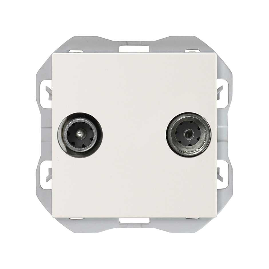 Toma de televisión y satélite intermedia de la Serie Simon 270, diseñada para instalaciones empotradas dentro de la colección de mecanismos. Perteneciente a la subserie S270 Estética Tradicional ICON en color blanco, ofrece una integración discreta y ele